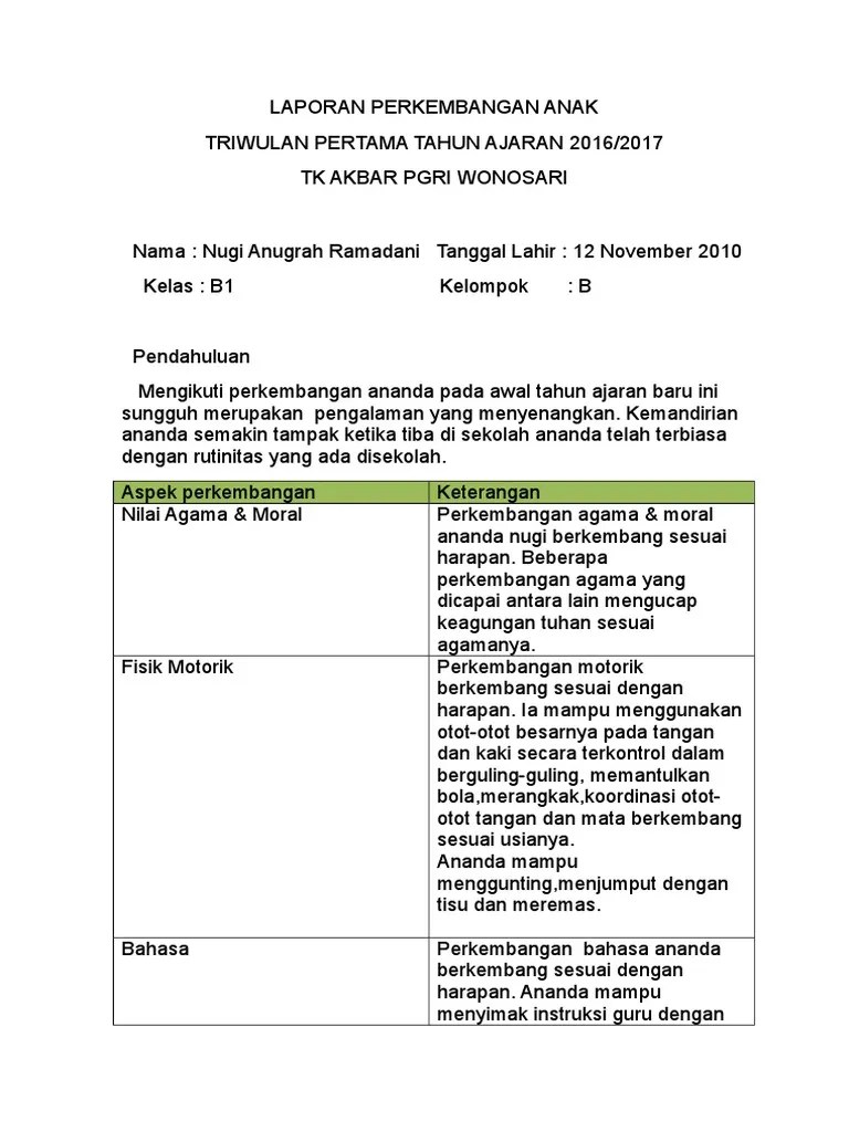contoh penulisan narasi raport sesuai kurikulum 2013. Doc bimbingan konseling contoh pelaporan perkembangan anak usia. Sebentar lagi akhir semester ganjil dan ibu guru (bunda) paud saatnya membaagikan laporan perkembangan anak (raport) , maka tidak ada salahnya kalau kita saling share bagaimana cara menuliskan laporan perkembangan anak (rapor). Penilaian dan pelaporan tumbuh kembang anak usia dini ppt download. Koleksi admin mengenai contoh narasi laporan perkembangan anak tk. Pertumbuhan perkembangan dan permasalahan anak tk. laporan pencapaian perkembangan anak lppa docx google drive. Kumpulan soal pelajaran 3 soal anak tk b semester 2. Dalam kesempatan ini saya akan share.silahkan , bisa dipakai untuk bahan rujukan atau pertimbangan. Inilah pembahasan selengkapnya mengenai contoh narasi laporan perkembangan anak tk b semester 2. Berbagai informasi mengenai contoh narasi laporan perkembangan anak tk b semester 1. Aug 24, 2021 · narasi raport tk kurikulum 2013 semester 2 berisi tentang proses pembuatan dan pengaturan raport untuk anak tk disertai contoh narasinya. Inilah pembahasan selengkapnya mengenai contoh laporan perkembangan anak tk semester 2.